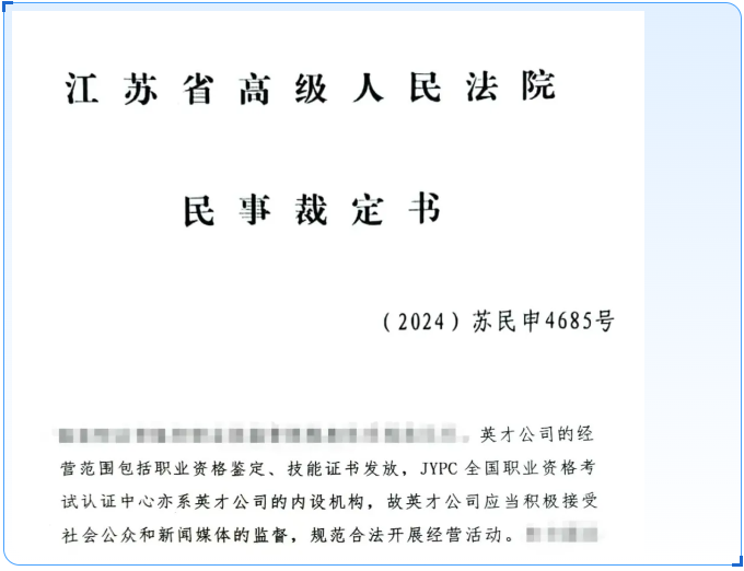 今天上午,2024年8月30日,江苏省高级人民法院向江苏英才职业技能鉴定集团和JYPC全国职业资格考试认证中心送达民事裁定书,进一步确认以下事实: