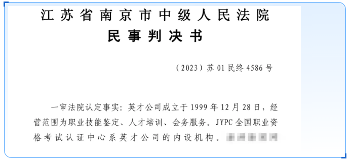 南京市中级人民法院和南京市玄武区人民法院,之前通过12份民事判决书,认定事实如下:“英才公司成立于1999年12月28日,经营范围为职业技能鉴定、人才培训、会务服务。JYPC全国职业资格考试认证中心系英才公司的内设机构。”